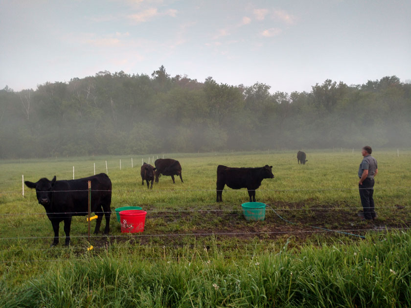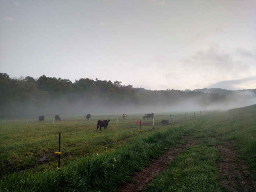 Seems like that’s all we do! Last weekend we started fencing the last large paddock for the cows. And, this weekend we plan to finish it. Next Craig has to get the baler and rake ready because it won’t be long til haying time! Our cows are looking great! Still waiting for more calves- should be any day now! We lined up a bull to be leased from July – September and hope we can get through our list of projects by summer’s end. We are still working on the landscape for our house also. But, on Monday we stop to appreciate Memorial Day! So lucky to live here and be free to work and enjoy our farm! Attached are a couple cool photos of the pasture after a storm with fog rolling in. Pretty cool on the farm!